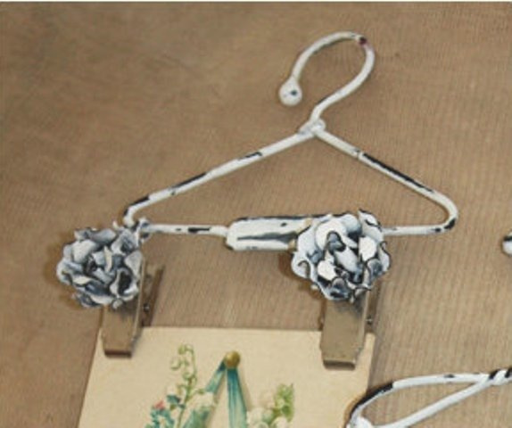 Wieszak metalowy biały postarzany z ozdobnymi kwiatami i klamerkami. Idealny do powieszenia wszelkiego rodzaju prac kreatywnych: kartek, obrazków, LO itp. Rozmiar: 4'' ok. 10,16 cm.