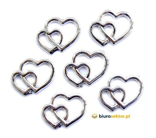 Plastikowe aplikacje połączonych serduszek ślubnych to doskonały dodatek do wszelkiego rodzaju prac kreatywnych, scrapbookingu i prezentu ślubnego. Idealne do elementów garderoby i wystroju wnętrz ślubnych, a także do dekorowania pudełek i wielu innych. Rozmiar: 1,9 x 1,5 cm. Kolor: srebrny. W opakowaniu 25 szt.
