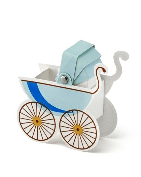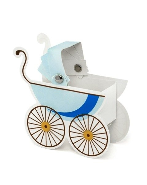 Pudełko w kształcie wózka dziecięcego na upominek dla gości lub jako dekoracja exploding boxa. Do środka można nasypać słodkich migdałów lub włożyć pralinki. Wykonane z białego papieru z nadrukowanymi motywami wózka i z rozkładanym daszkiem. Rozmiar: wysokość 9,5 cm, szerokość 4 cm, długość 9,5 cm. Cena za 1 szt. pudełka.