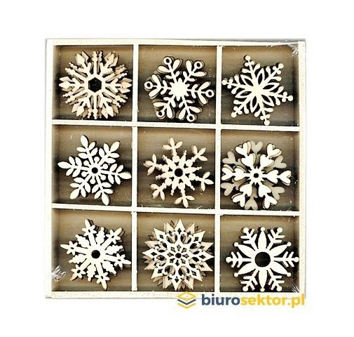 Drewniane ozdoby o kształtach śnieżynek. Idealne do dekoracji i kreatywnych projektów. Opakowanie zawiera 45 szt. elementów w 9 rodzajach zapakowanych w drewniane pudełko. Przeciętny rozmiar elementów to ok:. 2 - 2,5 do 3 cm.