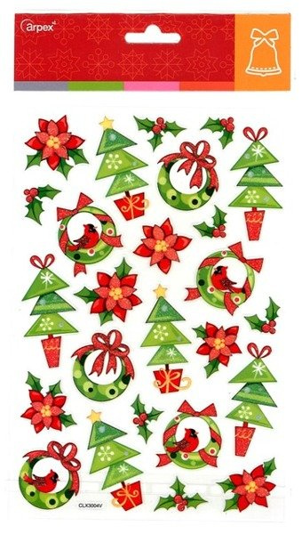 Naklejki z brokatem w kształcie choinek i świątecznych wianków w żywych kolorach znakomicie wyzwalają aktywność twórczą wszelkiego rodzaju. Doskonale sprawdzają się w cardmakingu, scrapbookingu oraz wielu innych technikach kreatywnych. Rozmiar arkusza 14 x 22 cm.