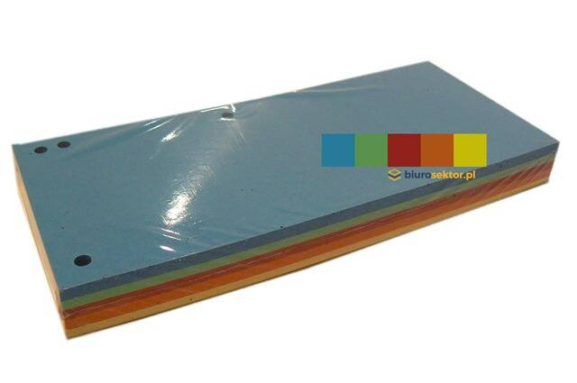 Przekładki do segregatora w intensywnych pięciu kolorach: niebieskim, zielonym, czerwonym, pomarańczowym i żółtym w rozmiarze 1/3 A4. Przeznaczone do segregowania dokumentów i utrzymania ich przejrzystości. Odpowiednia długość pozwala na naniesienie opisu zawartości, widocznego po zamknięciu segregatora. Wykonane z mocnego, kolorowego kartonu.