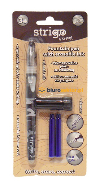 Pióro z klasyczną irydową, odporną na nacisk stalówkę, która gwarantuje dłuższe użytkowanie. Pióro ma łatwo wymieniane naboje z niebieskim tuszem, który po napisaniu można wymazać gumką. Idealne do nauki pisania, dzięki wyprofilowanemu gumowemu uchwytowi. Lekka i ergonomiczna obudowa nie męczy ręki. Odpowiednie dla osób praworęcznych i leworęcznych. W zestawie dwa naboje oraz czyścik do stalówki, gdy pióro jest nieużywane przez kilka dni, zaleca się użycie czyścika. Stalówkę wystarczy wówczas włożyć do czyścika. Idealne do codziennego pisania w biurze, robienia notatek, rozwiązywania krzyżówek oraz uzupełniania szkolnych zadań.