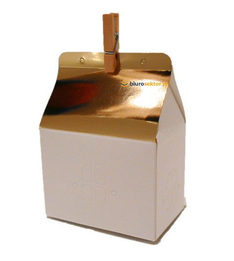 Pudełka z białej tektury w kształcie białych domków ze złotym lustrzanym dachem. Idealne na upominek, do środka można nasypać słodkich migdałów, włożyć pralinki lub inny drobiazg. Domki mogą być też dekoracją świątecznego stołu, choinki lub elementem kalendarza adwentowego. Wykonane ze sztywnego białego papieru, z bigowaniem, aby ułatwić złożenie oraz nacięciem w okienkach na ściankach. Dach domków można przewiązać tasiemką / sznurkiem lub spiąć klamerką. Rozmiar po złożeniu: wysokość z dachem 9,5 cm, wysokość samych ścianek 6 cm, szerokość 8 cm, głębokość 5 cm. W opakowaniu 5 domków do samodzielnego złożenia oraz 5 drewnianych klamerek.