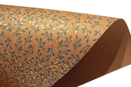 Arkusz papieru B2 w naturalnym kolorze z motywem zielonych gałązek jemioły i srebrnymi błyszczącymi kropkami. Papier pochodzący z recyklingu stwarza wiele możliwości ciekawych aranżacji i doskonale ułatwia pracę twórczą. Idealny do scrapbookingu jako tło lub do oklejania większych płaszczyzn (np. pudełek). Drukowany z jednej strony. Gramatura 220 g/m2.