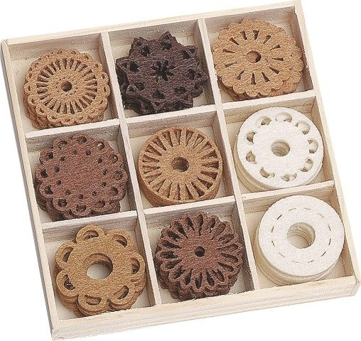 Filcowe ornamenty idealne do dekoracji i wszelkich kreatywnych projektów. Opakowanie zawiera 45 szt. ornamentów w kształcie rozetek o wymiarach 2,3-3 cm. Zapakowane w drewniane pudełko o wymiarach 9 x 9 cm.
